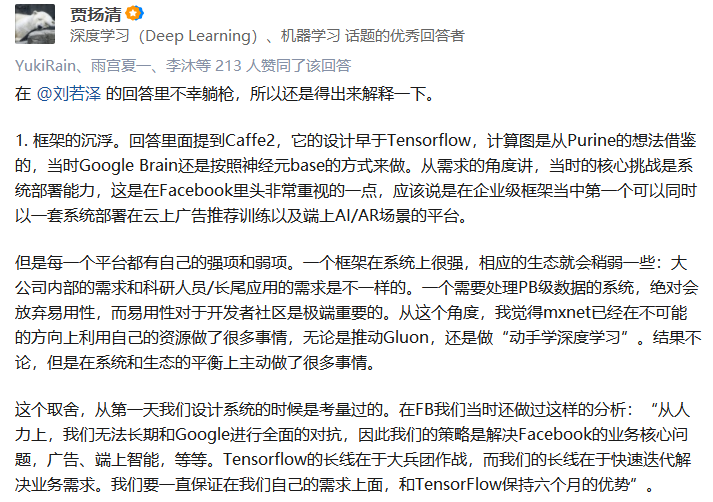 回头看我觉得这个策略非常成功,也推动了系统上的创新,ImageNet in an Hour被Jensen评价”也许是2017年深度学习系统最重要的论文“。据我理解,Facebook今天广告、手机AI等方面,前端在逐渐转向pytorch原语,后端系统继续使用caffe2的高性能架构。这和我离开前和Facebook同事设计的PyTorch 1.0的策略是一致的。