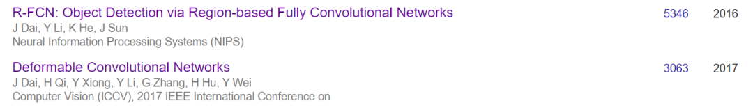 在此期间,代季峰以一作身份完成了一些重要工作,包括R-FCN目标检测算法和Deformable ConvNets等,两篇论文的引用量都在3000以上。