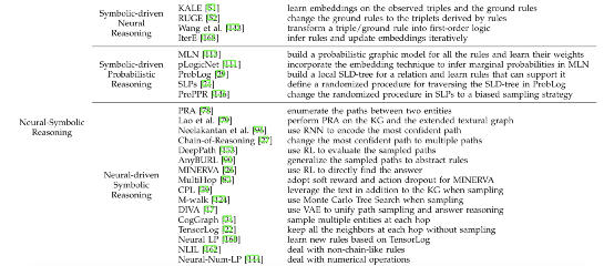 相比于之前的两种类型,神经驱动的符号推理的目的是挖掘规则,而神经网络在其中扮演的作用是解决纯符号推理的不确定性,并且能够有效的减少搜索空间。这种类型的方法的基本思路是找到query的多跳邻居节点,然后根据概率从这些邻居节点中选择正确的答案。这类方法大致可以分为三类,基于路径的、基于图的和基于矩阵的。