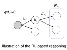 基本思想是将推理过程建模为马尔可夫决策过程,和agent交互的环境状态是由当前节点的embedding和目标embedding来构成的。它的奖励函数是手工设计的,考虑了不同的方面,另外,一开始使用了监督学习预训练防止搜索空间过大。