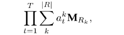 在tensorlog框架中,实体使用onehot向量表示,每一种关系都使用邻接矩阵表示,那么一个head relation所对应的若干条关系可以表示成如下形式:
