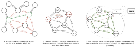 基于图的推理,GraIL利用图神经网络从抽取的子图中来推理。基本步骤如图,首先抽取head和tail周围的k跳邻居节点,然后对于每个邻居节点,用一个tuple来表示其特征,其中有两个元素,代表该节点到head和tail的距离。