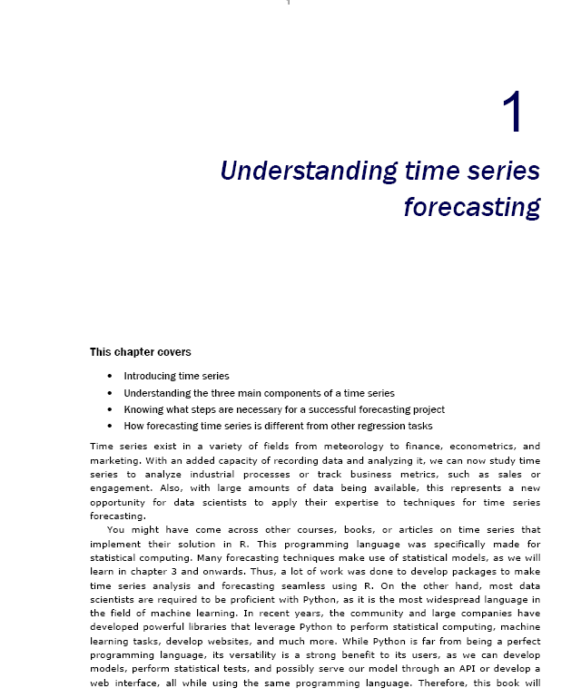 从数据中的基于时间的模式构建预测模型。掌握统计模型,包括时间序列预测的新的深度学习方法。Python中的时间序列预测将教你从基于时间的数据构建强大的预测模型。你创建的每个模型都是相关的,有用的,并且很容易用Python实现。您将探索有趣的真实世界数据集,如谷歌的每日股票价格和美国的经济数据,快速从基础发展到使用深度学习工具(如TensorFlow)开发大规模模型。Python中的时间序列预测(Time Series Forecasting)将教你应用时间序列预测并获得即时的、有意义的预测。您将学习时间序列预测的传统统计和新的深度学习模型,所有这些都用Python源代码充分说明。通过亲身参与预测航空旅行、药物处方量和强生公司(Johnson & Johnson)收入的项目来测试你的技能。学习本书后,您将准备好使用Python生态系统中的工具构建准确和有洞察力的预测模型。