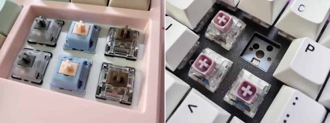 左:GANSS HS87T 采用的钢定位板(量产键盘,白色喷漆);右:客制化键盘套件采用的 PC 定位板(透明,下方为黑色夹心棉)