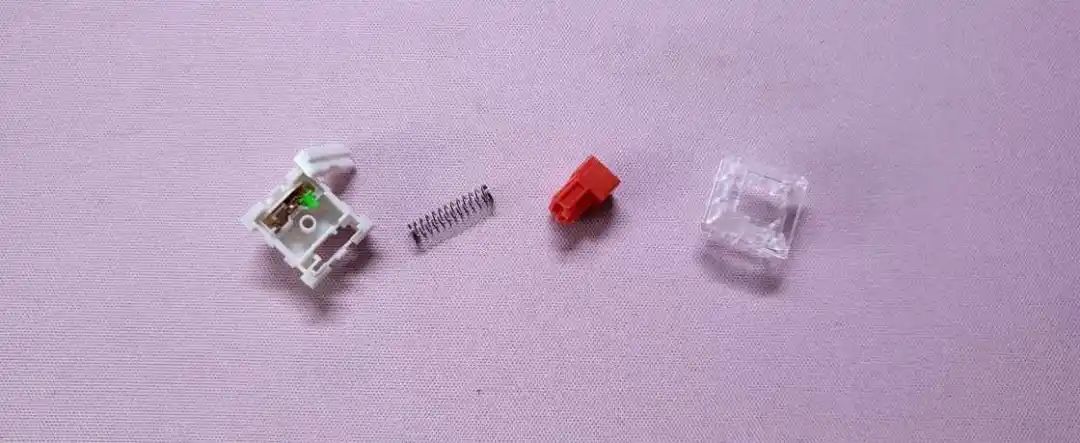 机械键盘轴体可以大致分为 4 个大部分,轴盖、底座、轴心、弹簧。在前一篇,我讲过机械轴体的触发原理,其中提及的推杆就是轴心,它的形状决定了轴体的基本手感;弹簧决定了轴体的轻重(压力克数);动静片两个金属片就嵌在底座上,用镊子也可以拔下来。