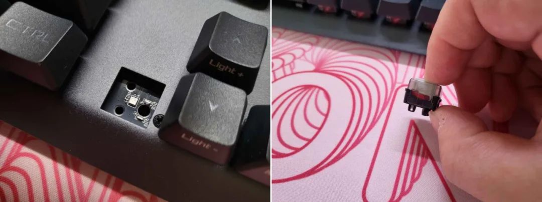 光轴机械键盘电路板上只有两个固定柱孔和一个光源-接收器开孔,轴体按下时有一节塑料伸出改变光路通断