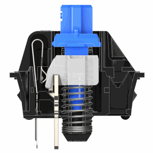 而对于青轴这样的有声段落轴来说,轴心小脚上除了出现凸起之外,还直接分成了两半。上半部分与键帽连接,下半部分则承托在弹簧上。当手指按下键帽,上半部分压动下半部分向下滑动。当动片的凸起越过轴心小脚上的凸起时,整个下半部分直接向下滑落,此时轴体触发。而当手指对上半部分的力松解,下半部分又突然上滑。在下落时,轴心下半部分突然下滑触底,发出「咔」的声音;在上抬时,轴心下半部分归位,发出「嗒」的声音。同时手上会感觉到相应的两次打击感,比段落轴带来的打击感更加明显。