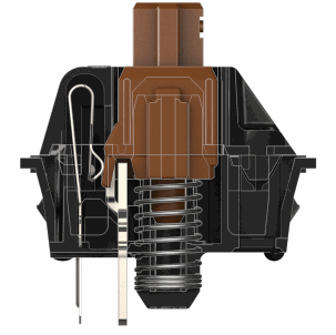 段落轴,或一段式段落轴,这类轴体也被称作类茶轴,因为段落轴中最著名的产品就是 Cherry MX Brown 樱桃茶轴。有人会把这种轴体称作「无声段落轴」,但这是不合理的。因为任何一种机械轴在实际使用时都会发出响声,即使是静音轴,也无法完全抹去轴体摩擦的声音。之所以将其称为无声段落轴,主要是为了与青轴形成对比,二者无论是轴心设计还是段落感的生成方式都有所不同。这类轴体没有特殊的发声设计,因此发出的声音主要是键程中通过凸起时发出的声响,以及轴心触底/触顶、定位板共振产生的响声。当快速打字时,使用者只能在按下时通过压力突然变化感觉到段落的存在,而回弹过程当中这一段落变得不再显著,因此被一部分玩家称为一段式段落轴。
