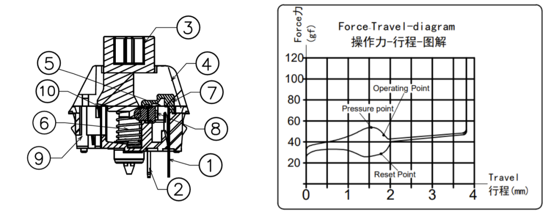 Cherry MX Brown 压力曲线与轴体示意,图源:cherrymx.de