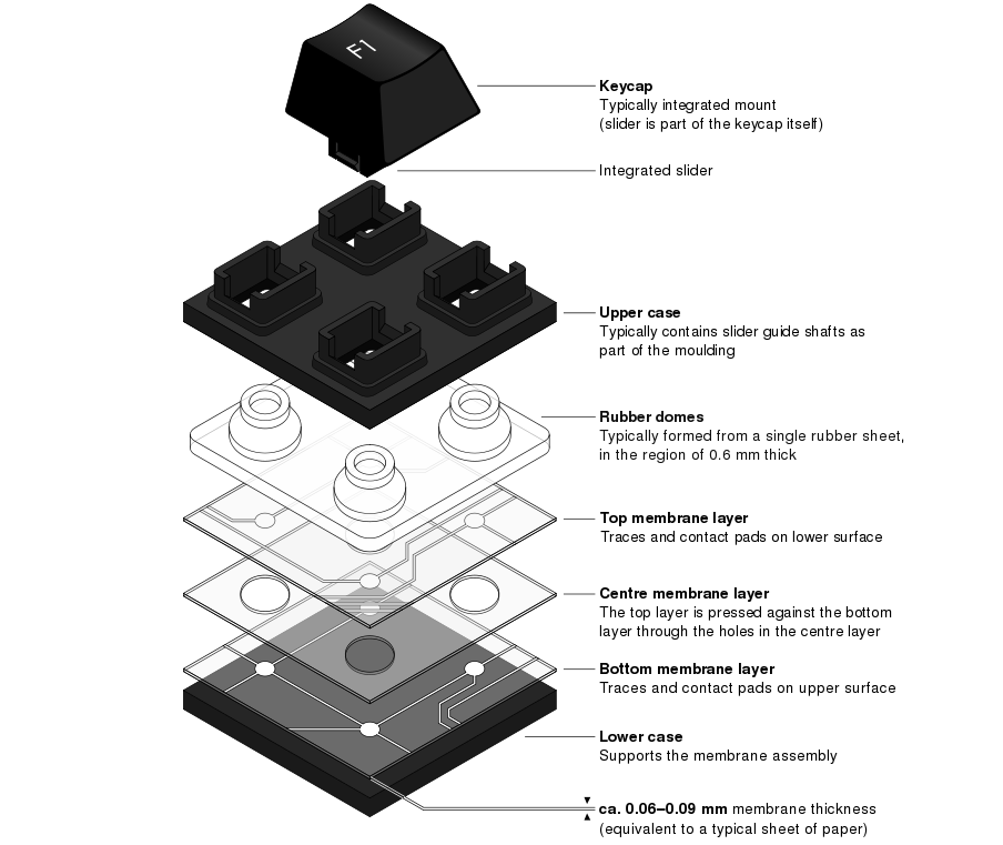对于更常见的薄膜键盘来说,触发结构是每一个按键下的橡胶碗(rubber dome,常称为胶碗)以及胶碗下的两张薄膜电路。手指按压键帽后,键帽压迫胶碗直至触底,这时由于压迫,两张薄膜电路在这一位点接触,于是接通。胶碗提供了弹力,让手指松开之后按键得以复位。至于「火山口」「剪刀脚」等薄膜键盘的差别,则是在胶碗上方的键帽和稳定装置的差别。当然,市面上的薄膜键盘还有其他的触发结构,比如在薄膜电路的上方放置一个类似机械轴体的装置,用于提供手感,过去和现在都有不少类似的薄膜电路上轴体设计。不过无论怎么变化,它们影响的都是「手感」,不影响薄膜键盘使用薄膜电路触发的本质。