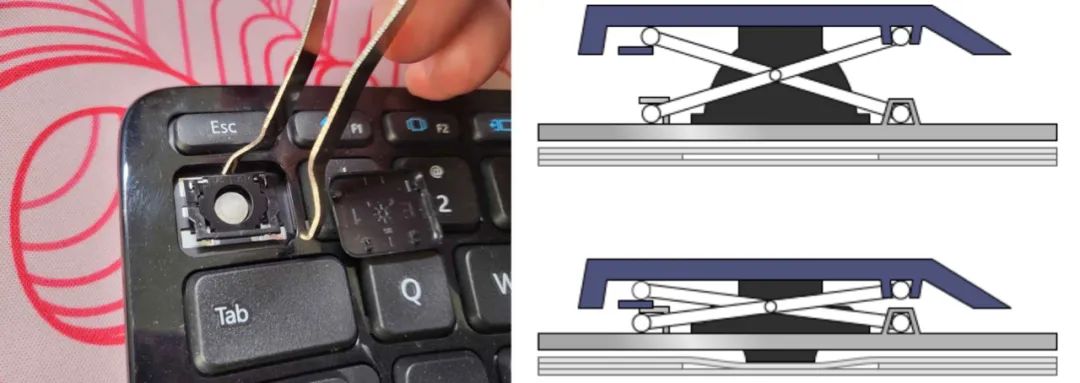 左图:微软 Sculpt 人体工学键盘的剪刀脚;右图:剪刀脚示意图,右图图源:Daniel Beardsmore from Deskthority "Scissor switch"