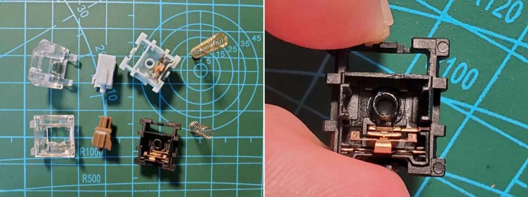 左:TTC 月白轴、TTC 静音茶轴 V2 Pro 拆解,右:轴底壳插着动静两簧片