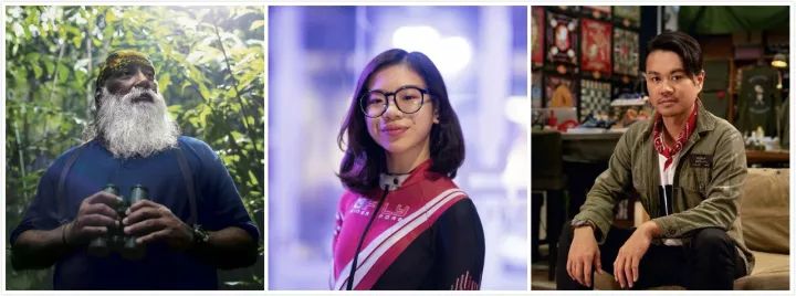 从左至右分别是新加坡环保主义者Subaraj Rajathurai、世界室内跳伞冠军Kyra Poh和鞋履设计师Mark Ong