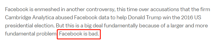 Facebook 被称作是全球最大的媒体网站,因此该企业树敌无数。媒体网站 Vox 在 Facebook 隐私泄露事件后发文指责后者,称“这无关政策,问题在于 Facebook 的核心商业模式”。在 Vox 的文章中,Facebook 核心商业模式就是“出卖用户”,正是他们开放了 API 接口,才有了今天的地位。Vox 激进的指出,Facebook 本身就是坏的。
