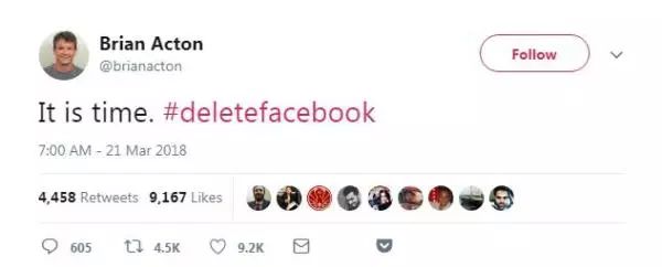 通信软件 Whatsapp 的联合创始人 Brain Acton 在推特上发文称,“是时候删除 Facebook 了”,并且在这条信息后面加上了“删除 Facebook”(#deletefacebook)的标签。不过这个标签并没有多火,仅有极少数用户发起了“删除 Facebook”标签。