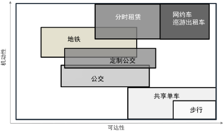结合传统的公共交通(常规公交和地铁)、传统巡游出租车和步行,可将4类共享交通方式在交通体系中的相对位置进行标定,剖析新旧业态之间的竞争、接驳、弥补关系。