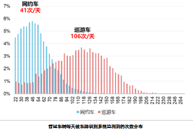 根据车牌识别系统对巡游和网约车活动的监测,专职从事网约车运营的小汽车超过5万辆,超过实际备案车辆规模;出行结构偏离预期,超过30%用于通勤通学,转移自巡游出租车客流(43%)、常规公交(21.5%)以及地铁(15%);路网压力增加,产生的道路周转量约相当于30万辆普通小汽车。