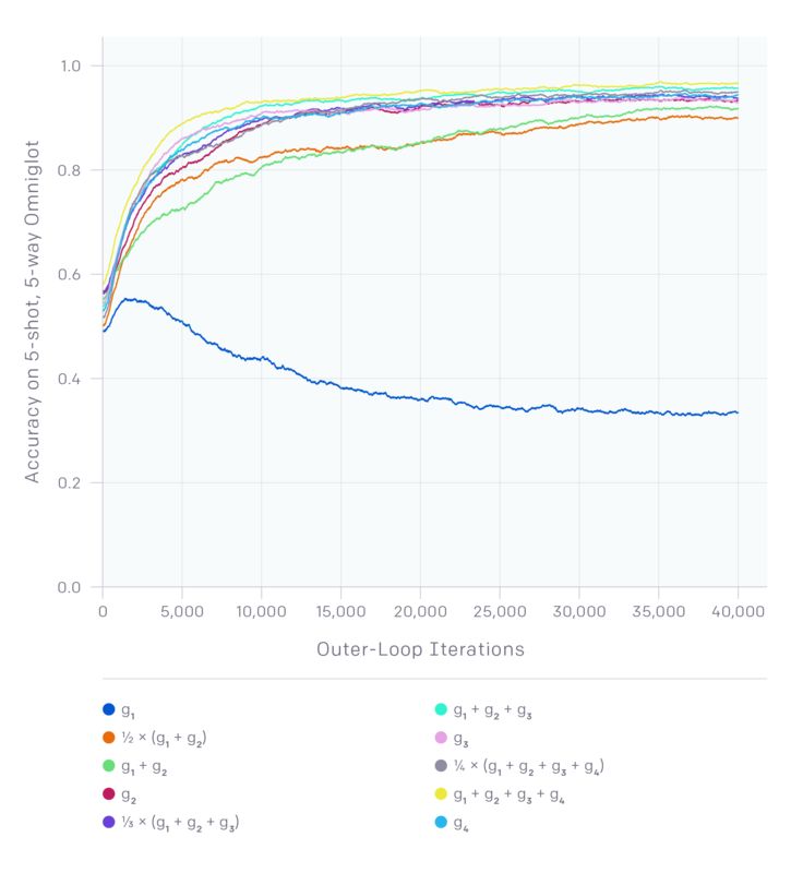 我们对 Reptile 的分析表明,我们可以使用不同的 SGD 梯度组合获得大量不同的算法。在下图中,假设我们在不同任务中使用不同批量大小的 SGD 执行 k 个步骤,会产生g1,g2,...,gk个梯度。下图显示了通过将每个和作为元梯度获得的 Omniglot 学习曲线。g2 对应一阶 MAML,这是一种在 MAML 原论文中提出的算法。由于方差减小,梯度增大,从而使得学习速度和收敛加快。请注意,仅使用 g1(对应 k=1)并取得产生本任务所预测那样的进展,因为零样本学习无法改善这一进程。