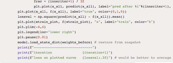最后,下面是一个 few-shot 回归的简单示例,预测 10(x,y) 对的随机正弦波。该示例基于 PyTorch: