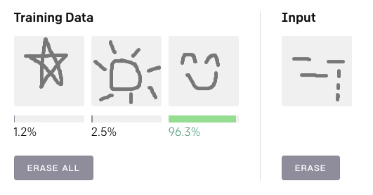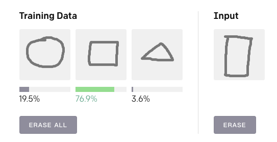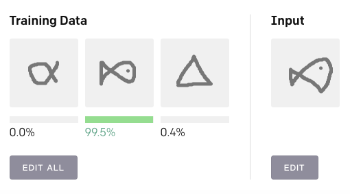 你可以单击“Edit All”按钮,绘制三个不同的形状或符号,然后再在右侧的输入字段中绘制其中一个,并查看 Reptile 如何对它们进行分类。前三张是标注样本:每张图都定义了一个类。第三张输入代表未知样本,最后 Reptile 将输出这张图片属于每个类别的概率。