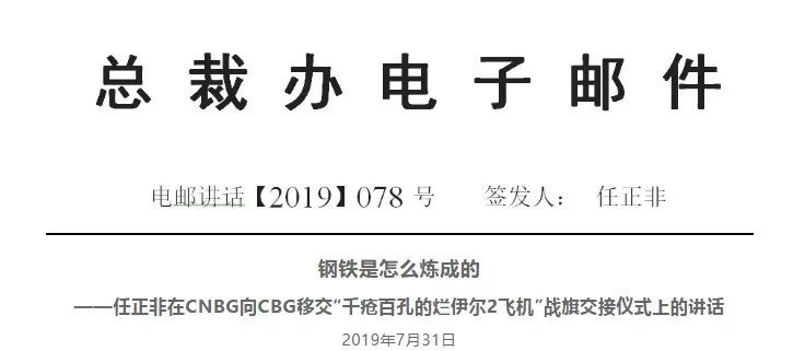 2019年7月31日,华为举行“千疮百孔的烂伊尔2飞机”战旗交接仪式,任正非在仪式上做了题为《钢铁是怎么炼成的》的讲话。该讲话内容以电邮讲话【2019】078号文面向全体员工发布。
