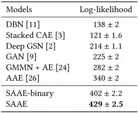 表 1 比较了 SAAE 与六种当前最佳方法的对数似然结果。我们的方法在这一标准上表现最优,超过 AAE 大约 89。