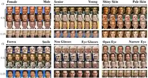 图 4:基于属性条件的图像生成,分成六个组(性别、年龄、肤色、表情、眼镜和眼睛大小)。