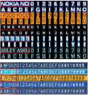 图 6:给定一张风格图像而生成的样本。上行:IIIT5K 数据集。下行:PLATE 数据集。对于每组生成样本,风格图像在左上角给出,用红色方框标出。对于 PLATE 数据集,我们因为隐私原因隐藏了汽车牌照的第一个汉语字符。