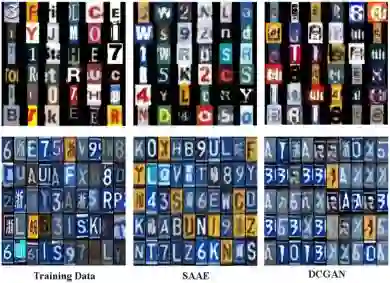 图 5 展示了我们的模型和 DCGAN 模型生成的图像中随机取出的样本,同时也给出训练数据以便比较。SAAE 生成的样本看起来更像字符而且有更清晰的边缘和背景。