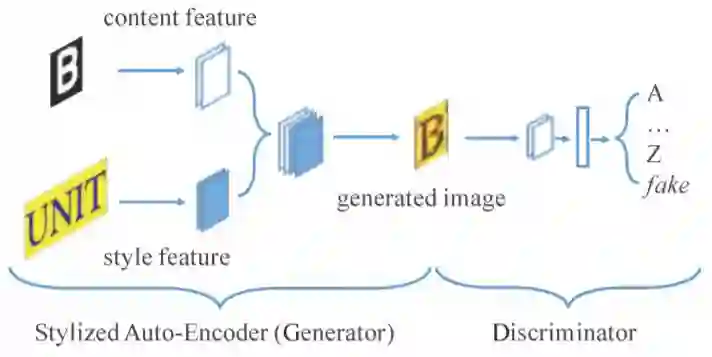 G 的目标是生成 D 无法将其与真实图像区分开的图像,即最大化 Ldis。前面已经提到,已有的 GAN 网络在 D 中使用二元分类器来确定图像是真实图像还是生成图像。但是,将所有真实图像放入一个大型的正例类别中将无法利用这些训练图像的内在形义结构。因此,我们提出使用多类分类器作为鉴别器,该分类器将确定输入是生成图像还是属于某个特定的真实图像类别(比如特定字符)。