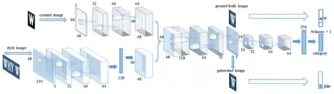 实际上,我们提出的生成网络包含两个特征提取网络流程,之后再跟上一个生成网络。内容特征提取器和风格特征提取器都有三个无下采样的卷积层,这样能尽可能多地保留示例图像的细节信息。输入的风格图像和内容图像可能有不同的尺寸。比如,当生成场景文本字符图像时,内容图像是含有一个字符的图像,风格图像是含有一个词或多个字符的图像。在三个卷积层之后,风格特征图(feature map)的形状会由一个全连接层重新调整为风格特征向量。为了与根据内容图像解码得到的内容特征图拼接到一起,风格特征向量需要重新调整回一个特征图,且该特征图与内容特征图具有一样的尺寸。内容特征提取网络没有任何全连接层,因为内容图像的二维空间信息需要保留。我们在通道维度中合并内容特征图和风格特征图,这意味着组合后的特征图有一半通道来自内容特征,另一半则来自风格特征。之后,生成网络使用三个卷积层将组合后的特征图解码成一张目标字符图像。