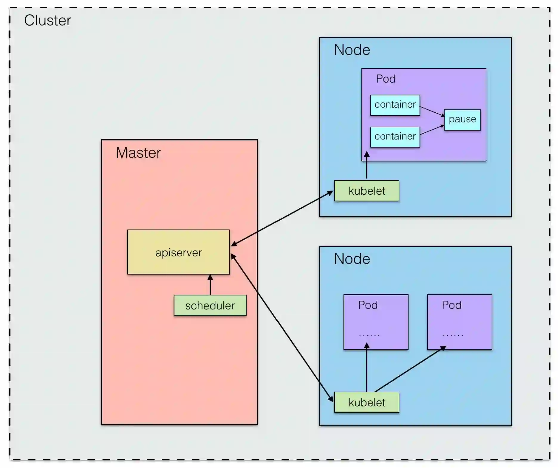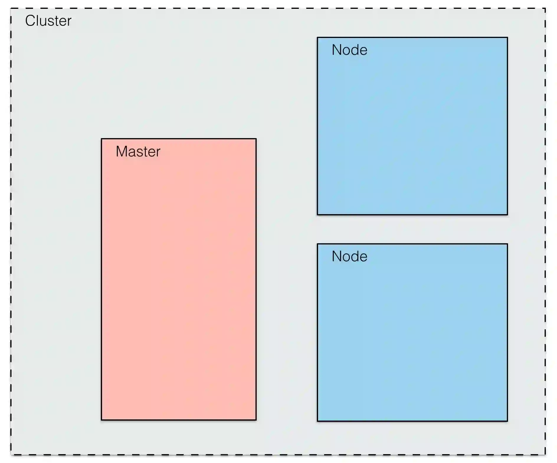 首先,既然是个分布式系统,那势必有多个 Node 节点(物理主机或虚拟机),它们共同组成一个分布式集群,并且这些节点中会有一个 Master 节点,由它来统一管理 Node 节点。