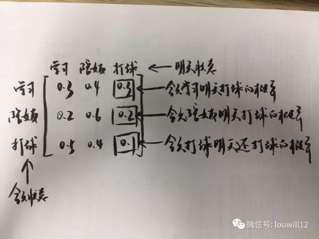 现在我们来做个假设,小编每个五点钟状态之间的转移都是有一定的概率支撑的。比如说,小编今天下午五点钟在篮球场打球,那明天陪女友的概率是多少呢?或者明天在学习的概率有多少呢?或者明天下午五点还在球场打球的概率是多少呢?小编手画个图,更直观一点: