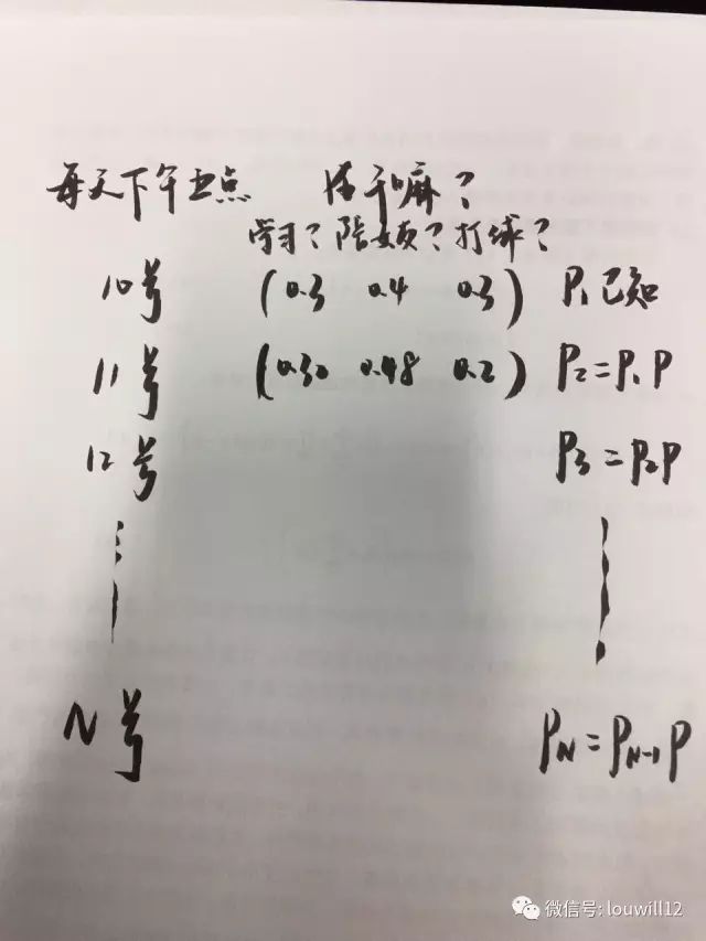 小编图中画的那个概率矩阵就是传说中的状态转移矩阵,我们把它命名为P。并且这个P是保持不变的,也就是说小编今天的到明天的状态转移矩阵和明天到后天的状态转移矩阵是一样的。有了这个矩阵之后,你们就可以推算出N天后小编下午五点的状态分布了。