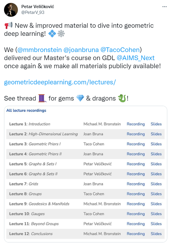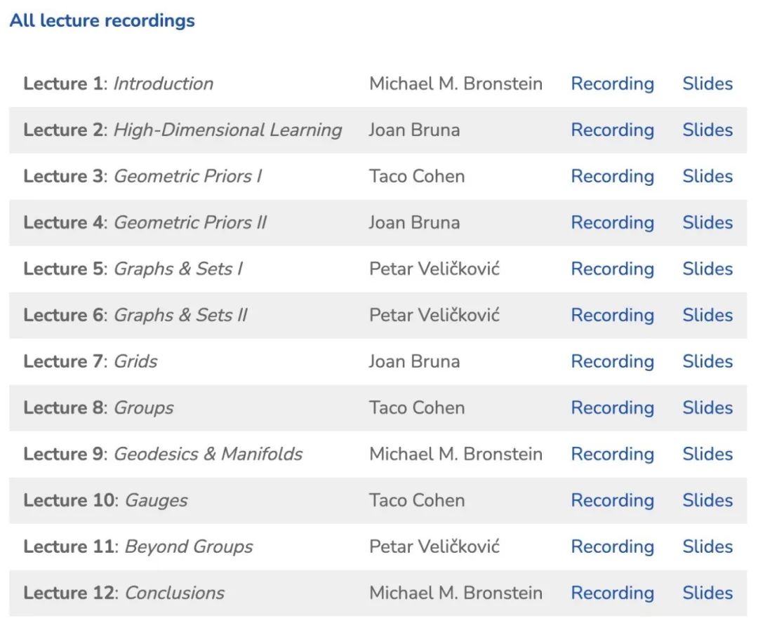 作为非洲机器智能硕士课程(AMMI 2021)的一部分,我们提供了一门关于几何深度学习(GDL100)的课程,它紧跟我们的GDL原型书的内容。我们使所有的材料和课件从这门课程公开可用,作为我们的原型书的同伴材料,以及一种方式深入到一些内容的未来迭代的书。