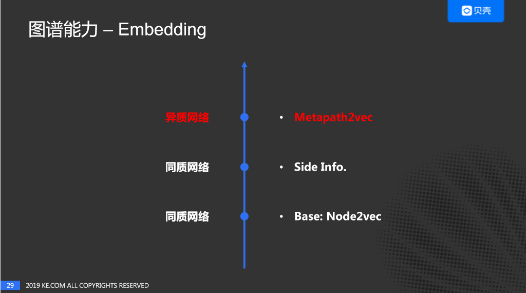 Graph Embedding近年来发展迅速,在各大公司陆续开始应用,并取得了不错的效果。结合贝壳自身的情况,对于同质图的网络采用的是Node2vec,并尝试使用Side Info来优化Node2vec;针对异质图网络尝试使用Metapath2vec。