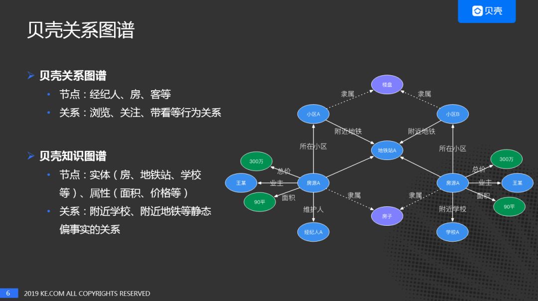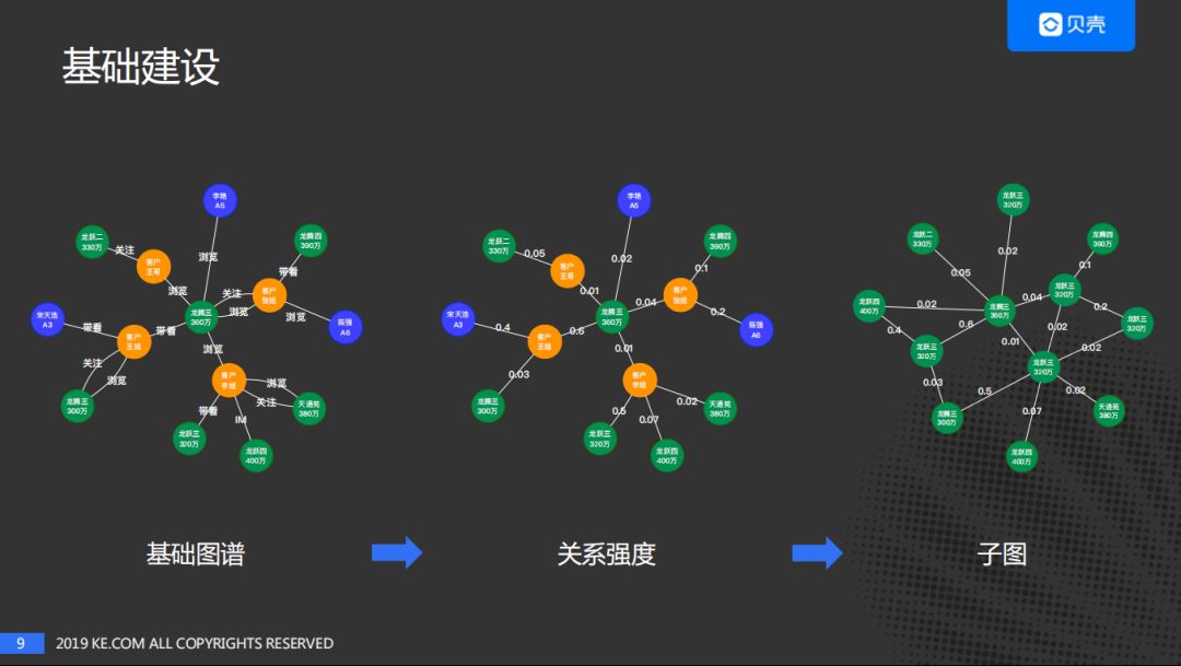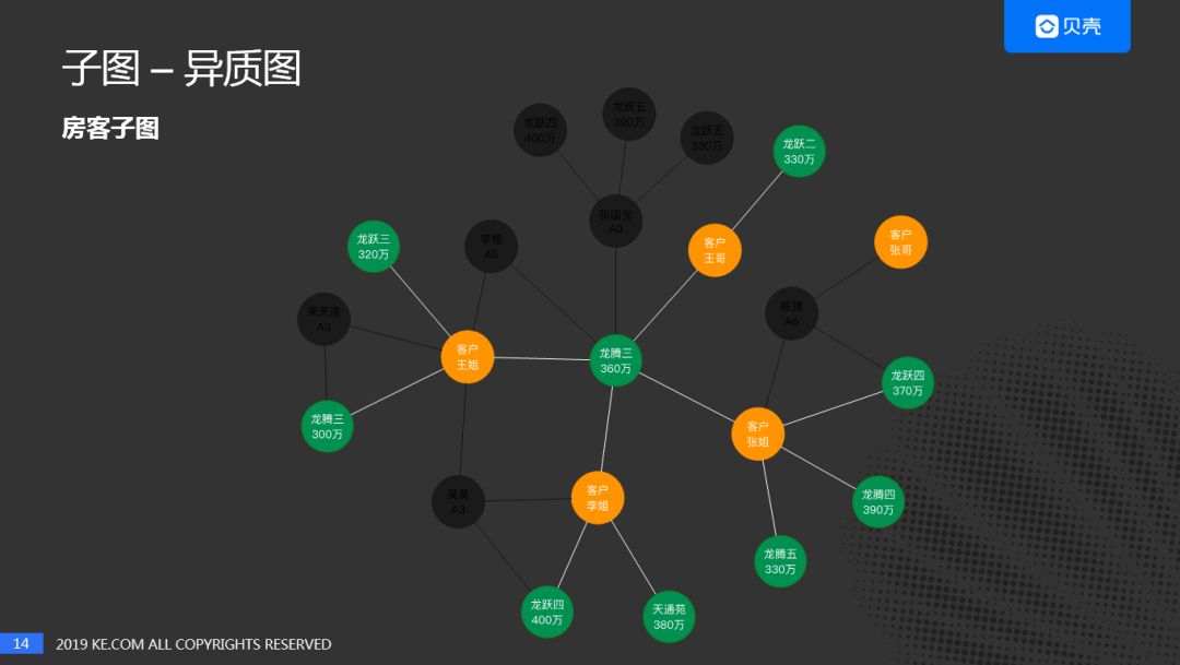 从第一行可以看出,贝壳的客户、房数量较大,每日新增也很大,经纪人增长也很快,小区相对稳定,增量不大。第二行是2019年贝壳找房房产行为数据。如何从如此庞大的数据中得到有用于决策的信息,是我们现在要做的工作。用什么方法挖掘数据背后的价值?我们想到了关系图谱。