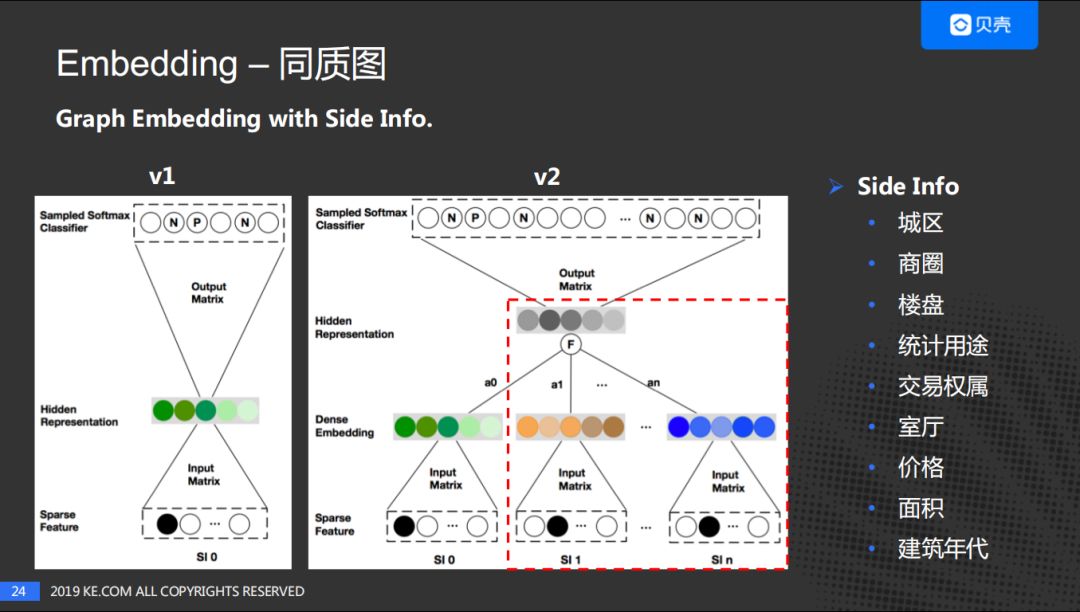 V1是Node2Vec,V2是Graph Embedding with Side Info。两个图中的SI0是通过随机游走产生的房子序列,右边的SI1到SIn是房源的特征,进行Embedding之后再做一个平均。Side Info,基于经纪人帮助我们评估,我们采用了右边的九大维度。