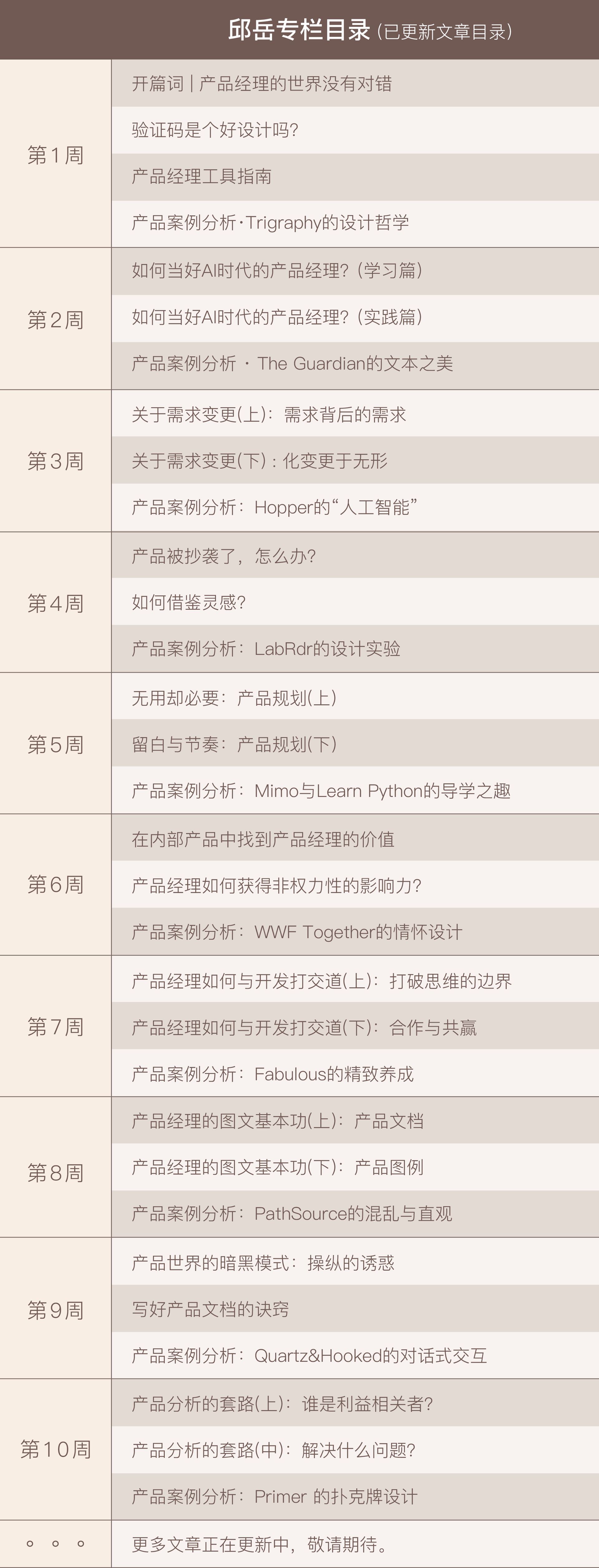去年 11 月我在极客时间开设了一个产品相关的专栏,转眼间,我成为专栏作者也已经好几个礼拜了,写专栏之前踌躇满志,池老师说你觉得自己可以写多少篇,我一边剔牙一边冷笑一边问他,来你告诉我世界纪录多少篇?