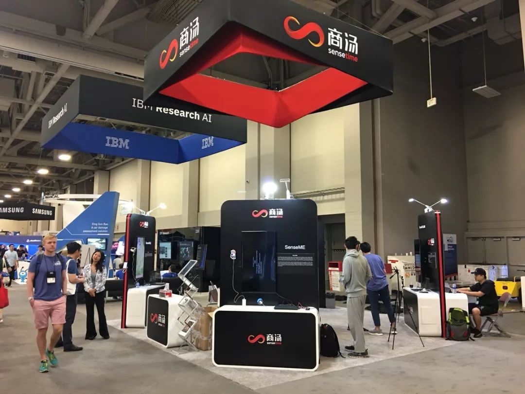 在那会儿,商汤的展台布置还比较简单:两边各摆上一张海报,中间摆着三台屏幕展示 demo,后面摆着几张桌子。