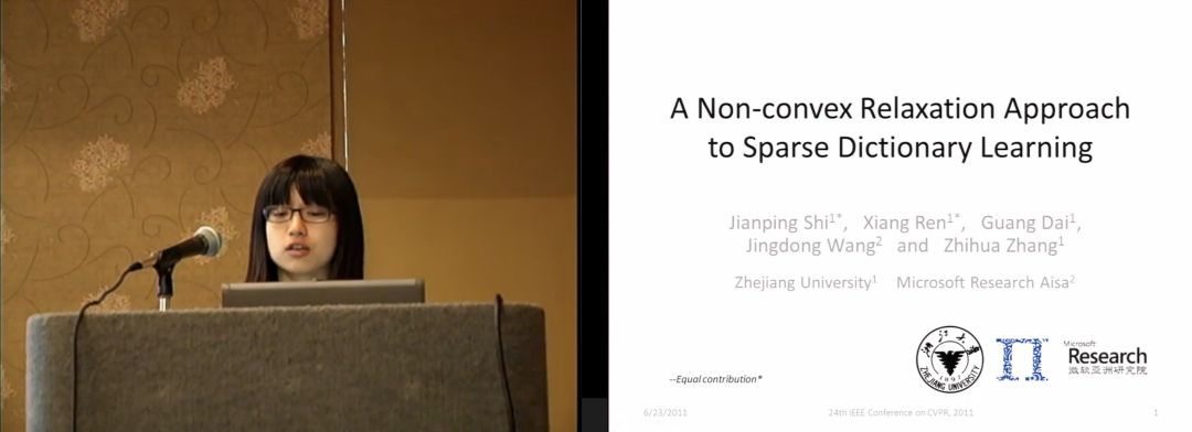 据不完全统计,石建萍可能是当时国内第一个论文入选 CVPR Oral 的本科生。她研究的课题是为A Non-Convex Relaxation Approach to Sparse Dictionary Learning。Sparce Dictionary Learning 在当时还是比较主流的研究课题(以基本元素的线性组合以及这些基本元素本身的形式找到输入数据的稀疏表示,也称为稀疏编码)。不过,深度学习到来后,这些方法都没有容身之处了。