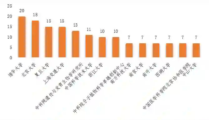 生物学学科高被引学者 327 人,分布在全国 101 个机构。高被引学者数量最多的前三机构为清华大学、北京大学、复旦大学和上海交通大学。非 211/985 高校有三所:南方科技大学、西湖大学、协和医学院。前十强机构如下图所示: