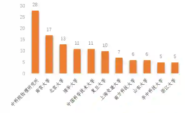 物理学学科高被引学者 216 人,分布在全国 66 个机构。高被引学者数量最多的前三机构为中科院物理研究所、南京大学、北京大学。中科院物理所的学者数量大幅领先于其他机构,南方科技大学是唯一的非 211/985 高校。前十强机构如下图所示:
