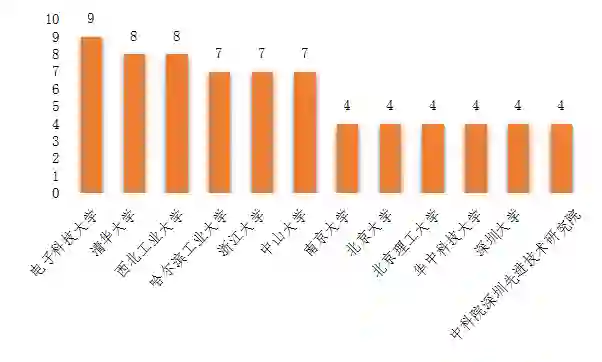 计算机科学与技术学科高被引学者 184 人,分布在全国 89 个机构。高被引学者数量最多的前三机构为电子科技大学、清华大学和西北工业大学。深圳大学是唯一的非 211/985 高校。前十强机构如下图所示: