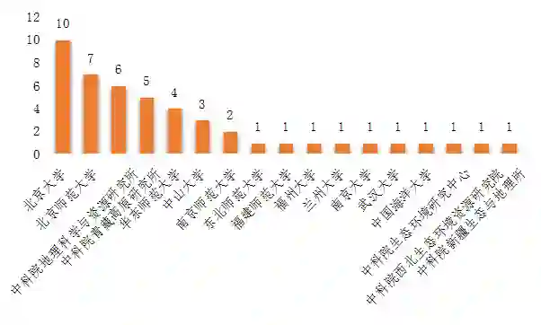 地理学学科高被引学者 47 人,分布在全国 17 个机构。高被引学者数量最多的前三机构为北京大学、北京师范大学、中科院地理科学与资源研究所。地理学科高被引学者分布的 17 家机构如下图所示: