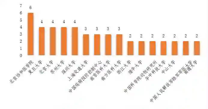 基础医学学科高被引学者 75 位,分布在全国 43 个机构。高被引学者数量最多的前三机构为北京协和医学院、复旦大学、北京大学、苏州大学和深圳大学。本领域非 211/985 高校上榜较多,包括苏州大学、南京医科大学、南方医科大学、陆军军医大学和南通大学等。前十强机构如下图所示: