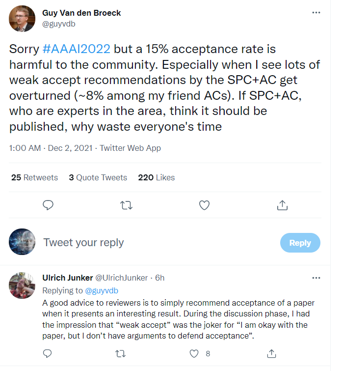 15%的录取率对社区是有害的。特别是当我看到很多weak acdept的SPC+AC被推翻(约8%在我的朋友ACs中)。如果SPC+AC是这个领域的专家,认为应该发表,为什么要浪费每个人的时间