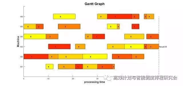 我们运用这个原则,以自然循环数列为例,按照文章最开头的机器约束矩阵和加工时间矩阵,作一个甘特图,说明这个数列实际上可以表示工厂作业排序优化问题的解。