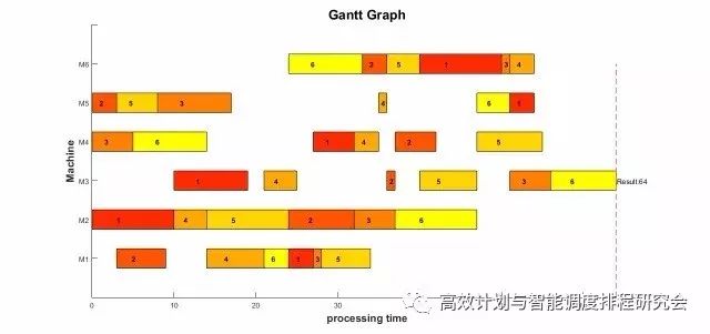 这里小智要解释一下,这个甘特图表示了工厂生产玩具的工作流程。图中每一个方块表示一个任务,方块当中标志的数字是指玩具的编号。这个甘特图,横坐标表示时间轴,纵坐标表示机器。从这个甘特图可以发现,一共有M1-M6,六台机器。
