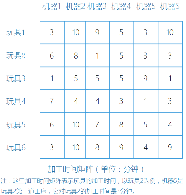 其中,加工顺序矩阵中的数字,代表玩具在各台机器的加工顺序;而加工时间矩阵中的数字,代表玩具在各台机器加工所需要的时间。
